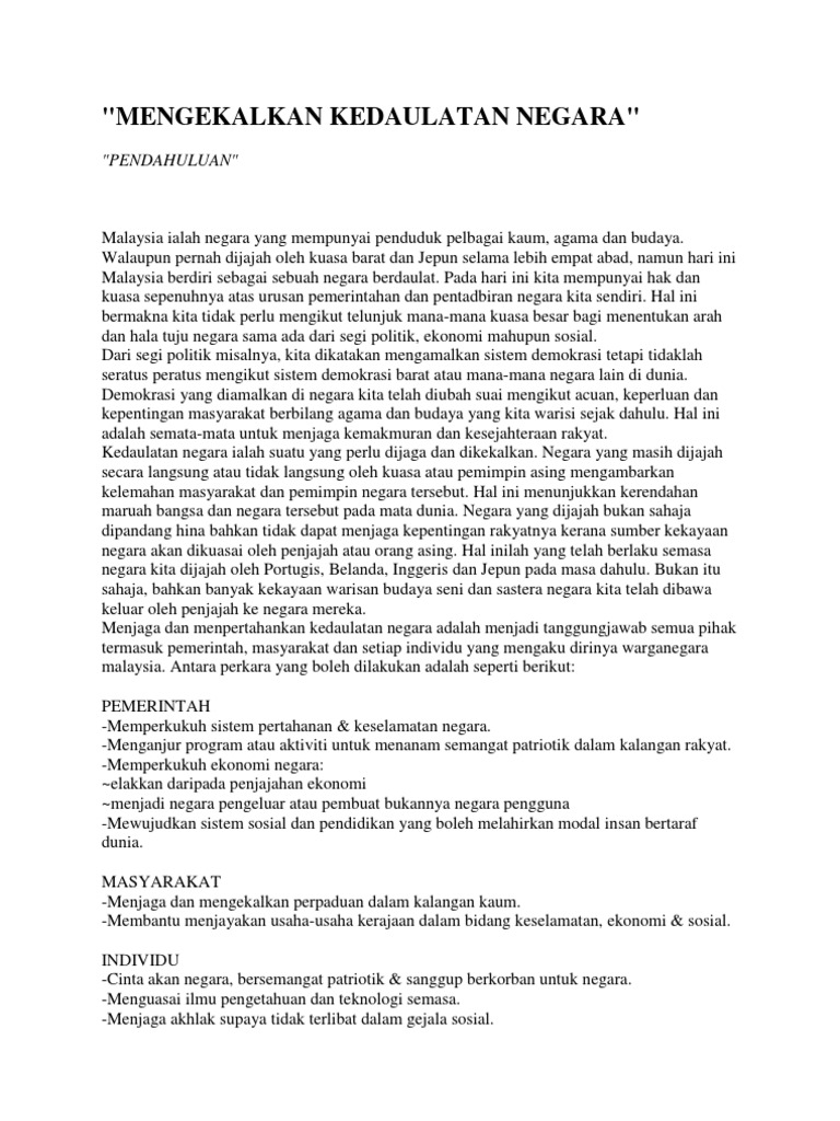 Sejarah view my complete profile. Kita perlu mengenali serta menghormati raja dan pemimpin negara kita kerana mereka yang berusaha mengekalkan keamanan dan kesejahteraan negara. Kedaulatan sebuah negara amat penting untuk dipelihara bagi memastikan keamanan negara dapat dikekalkan. Pemimpin yang cemerlang ialah seorang yang amanah dalam selain itu, rakyat turut mempunyai peranan dan tanggungjawab bagi mengekalkan keselamatan negara terutamanya golongan remaja. Kedaulatan merupakan perkara asas dalam sesebuah negara.